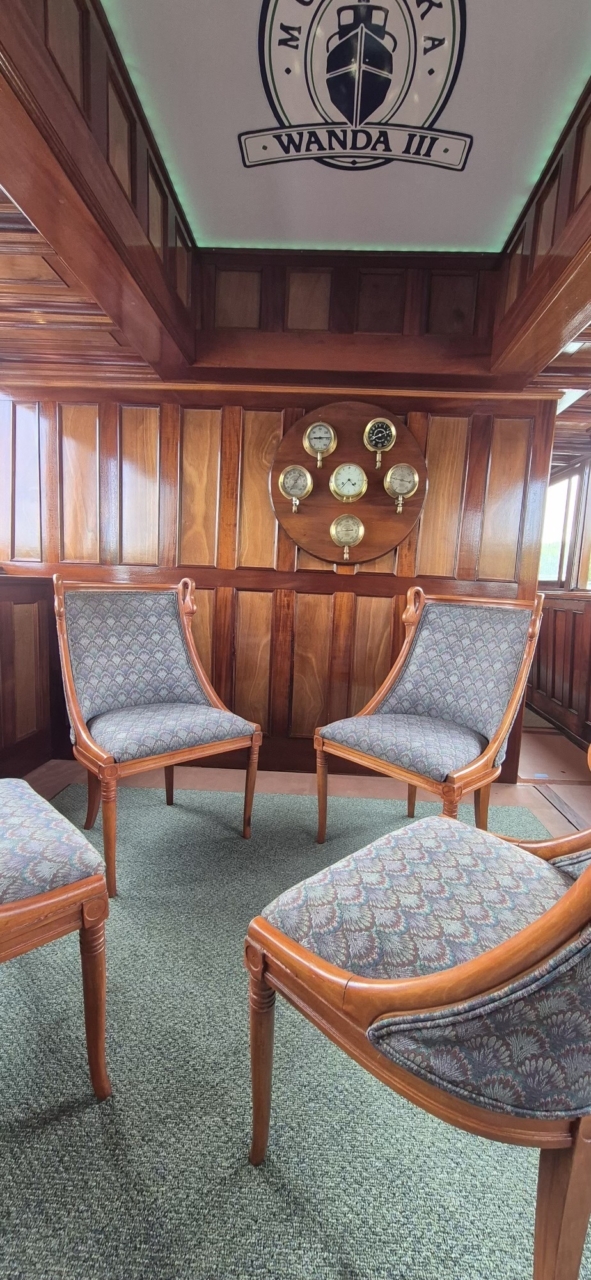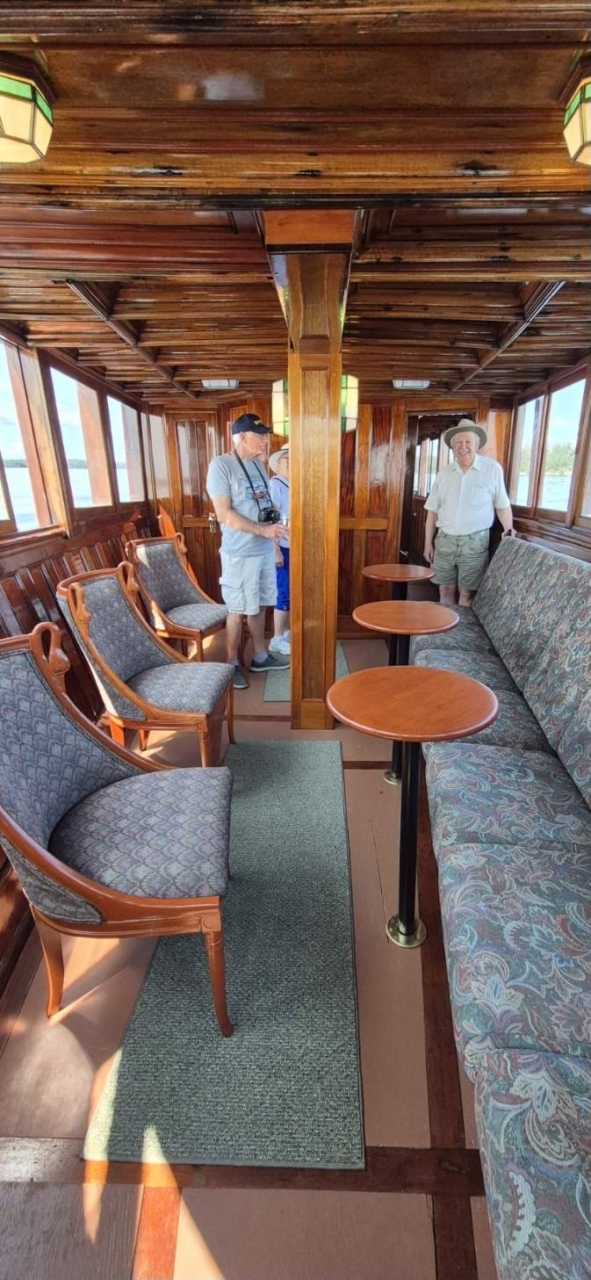 Experience the elegance and grandeur of days past as a passenger on Wanda III. An electrified propulsion allows you to sail in a quiet environment enjoying the scenery and conversation with your fellow passengers. The comfortable seating on the upper deck provides an intimate view of the water and landscape. The two lounges on the lower deck offer intimate and private conversation. Enjoy the sound of the new whistle on the lake.